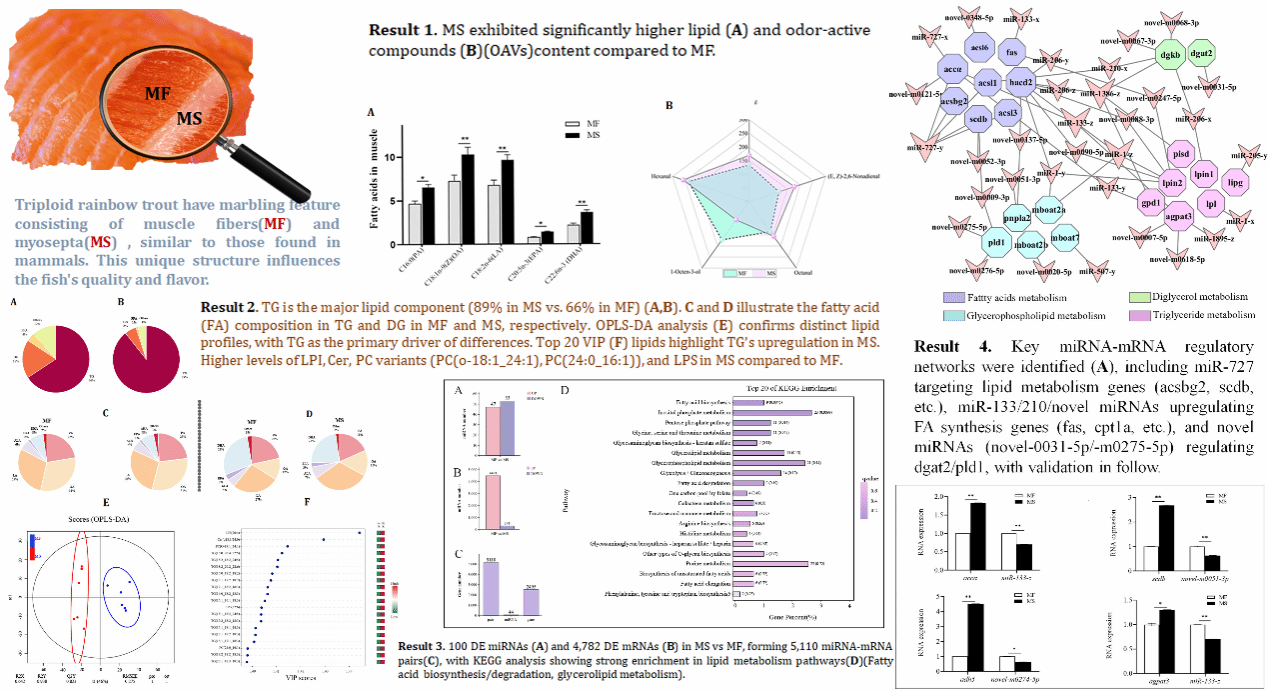 青海大学生态环境工程学院孟玉琼教授团队,基于脂质组学和全转录组学测序技术,成功构建了三倍体虹鳟肌肉异质性miRNA-mRNA调控网络,并通过qPCR验证了关键基因表达水平。结果表明,MS因其富含甘油三酯(TG)、溶血磷脂酰肌醇(LPI)、神经酰胺(Cer)、磷脂酰胆碱(PC)、溶血磷脂酰丝氨酸(LPS)以及多种脂肪酸(FA)成分,成为鱼肉风味的主要贡献者。为进一步探究其内在机制,本研究通过miRNA-mRNA测序发现,MF与MS组间共有100个miRNA和4782个mRNA差异表达。这些差异表达的mRNA主要参与多种脂质代谢通路。通过构建差异表达的miRNA–mRNA互作网络,我们发现miR-727、miRNA-133和miR-210通过靶向调控hacd2、fas等一系列基因,在FA代谢调控中发挥关键作用。此外,miR-1和miR-133通过靶向lpl、lipin2等基因促进MS中甘油三酯(TG)的积累;novel-m0348-5p通过调控acsl6的表达,增加MS中LPS-DHA的沉积。同时,miR-206、novel-0031-5p和novel-0137-5p可通过上调mboat2、dgat2等基因,调控MS中的二酰甘油和甘油磷脂代谢。综上,本研究为深入理解虹鳟“大理石纹”的形成机制以及品质调控的分子基础提供了新的见解。