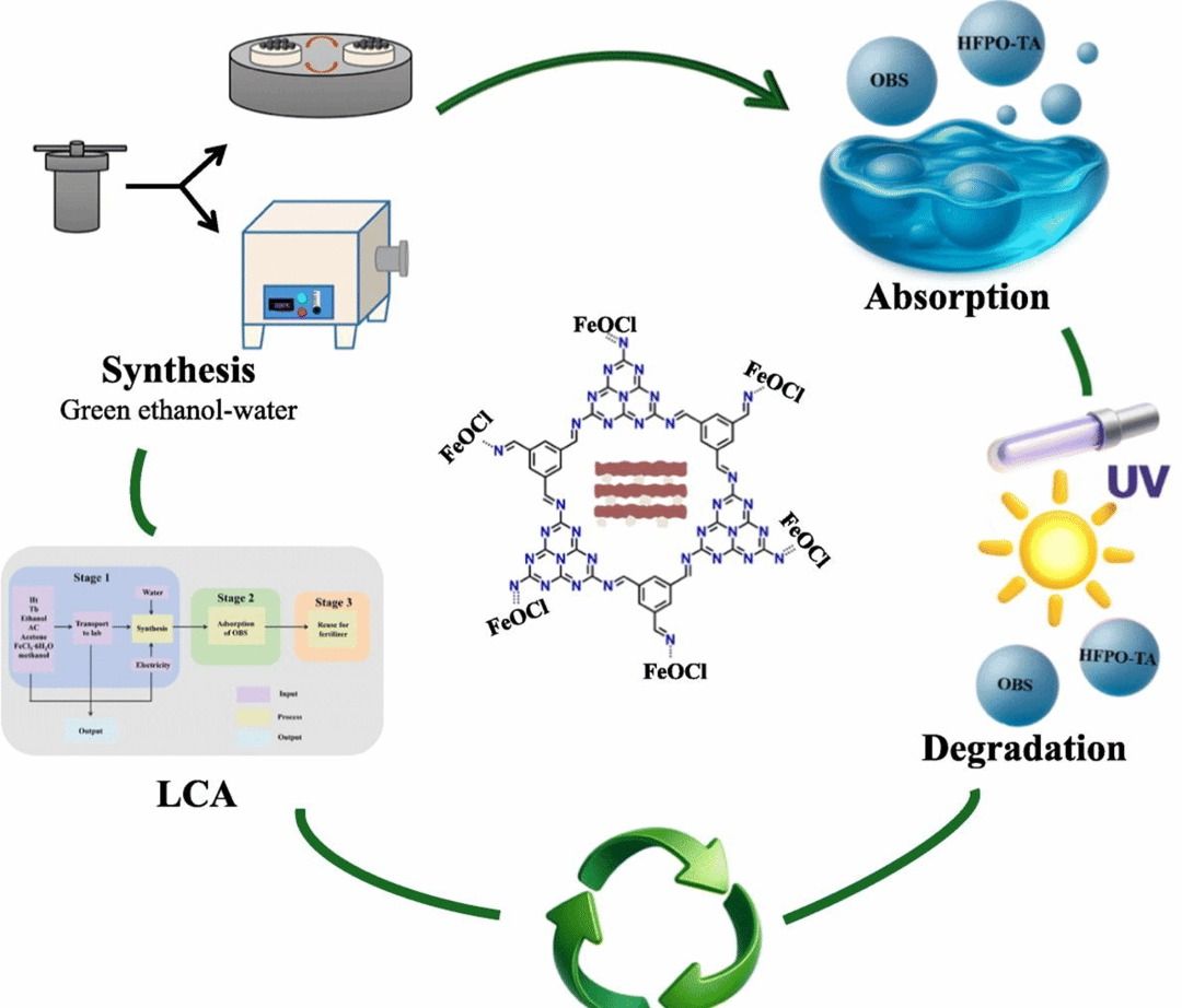 性能方面,COF-C表现出更优的综合去除能力:对HFPO-TA与OBS的最大吸附量分别达到276.548 mg/g与566.805 mg/g;在光照条件下,HFPO-TA与OBS的降解分别达到40.590%与99.308%,显示出“芳香OBS明显更易去除”的选择性特征。将光降解用于原位再生后,材料可稳定循环多次,仍保持高去除水平,显示出良好的复用潜力。LCA结果表明:在统一功能单位下,负载FeOCl尤其是COF-C的制备端环境足迹更低;溶剂与部分无机前驱体是足迹热点,提示通过溶剂优化与前驱体替代可进一步降低环境代价。