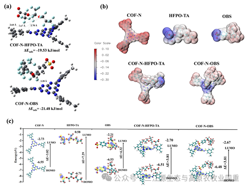 图2. HFPO-TA和OBS在COF-N侧链上的结合能(a),不同结构单元及吸附复合物的ESP 映射图(b),不同结构单元及吸附复合物的HOMO和LUMO图(c)